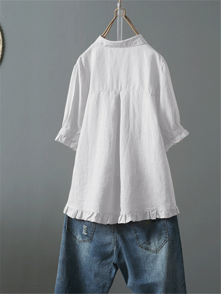 • Kobiety Vintage Button Turn Down Collar Koszulki pół rękawa w jednym kolorze