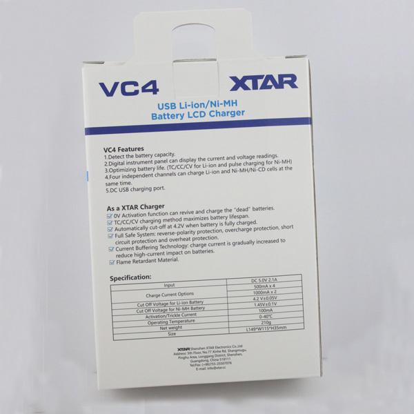 XTAR VC4 to nie tylko ulepszona wersja ładowarek VC2 i XP4c, ale także połączenie naszej zasady, aby nadal robić postępy i brać odpowiedzialność za bezpieczeństwo i ochronę środowiska. VC4 może jednocześnie rozpoznawać / wyświetlać / ładować akumulatory Ni-MH i Li-ion, a także wyświetla prąd ładowania, napięcie akumulatora i pojemność ładowania. Podświetlenie LCD może być wyłączone lub automatycznie włączone w tryb słabego oświetlenia w 2 minuty, aby zaoszczędzić więcej energii.