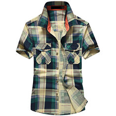 Mens Outdoor Cotton Plaid Printing Turn-down Collar Pocket Short Sleeve Casual Shirts